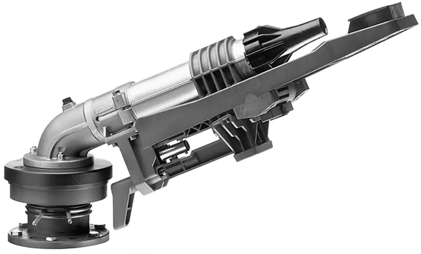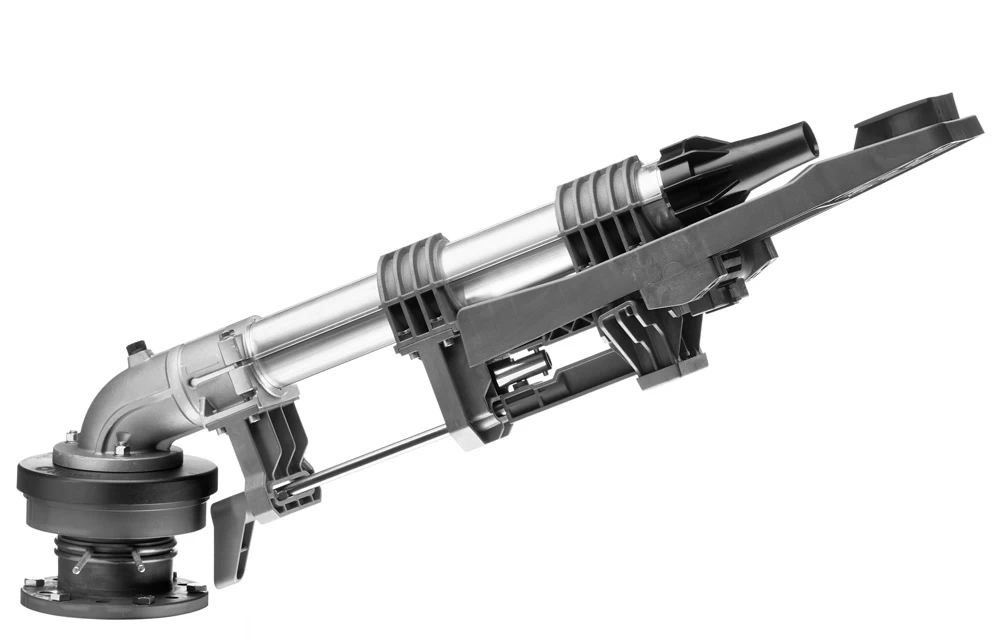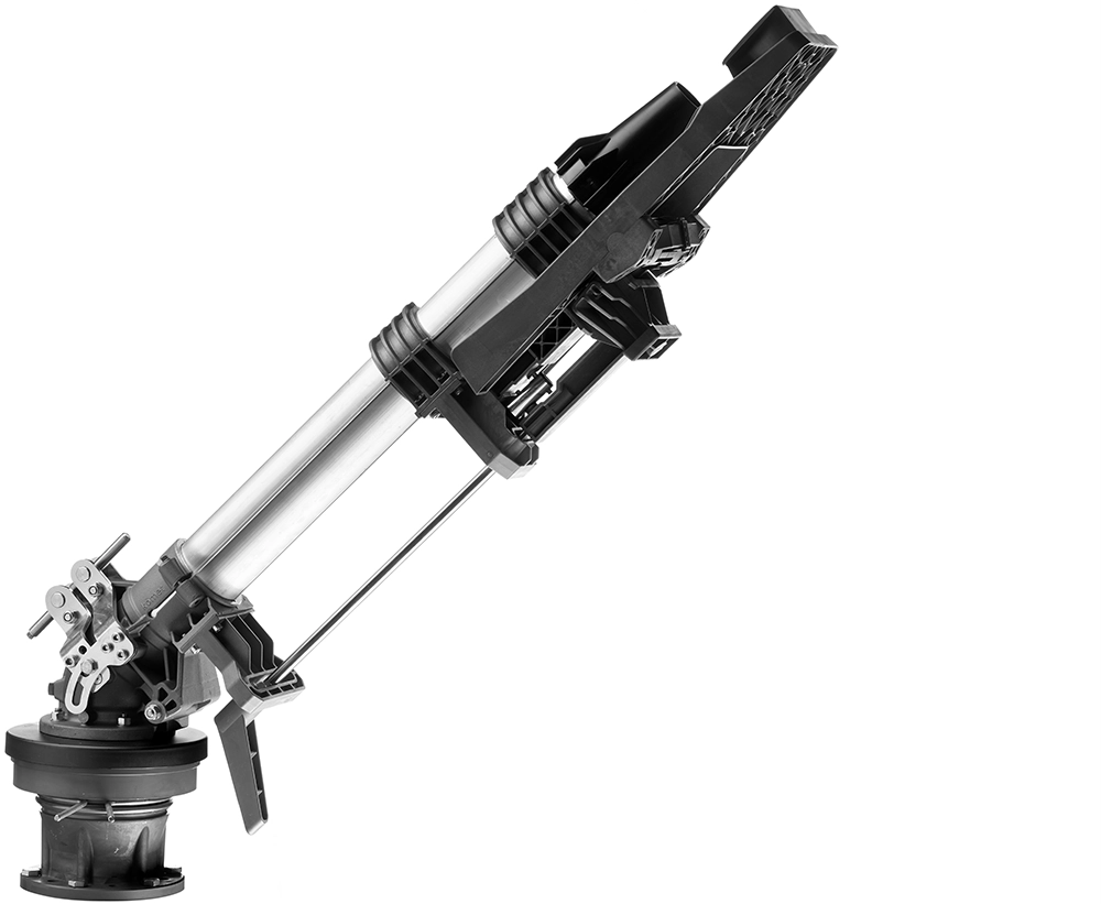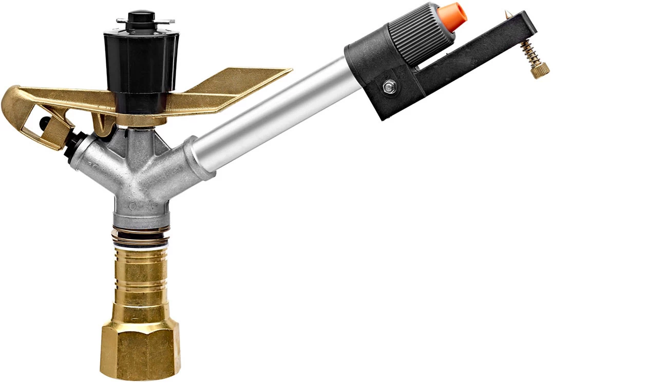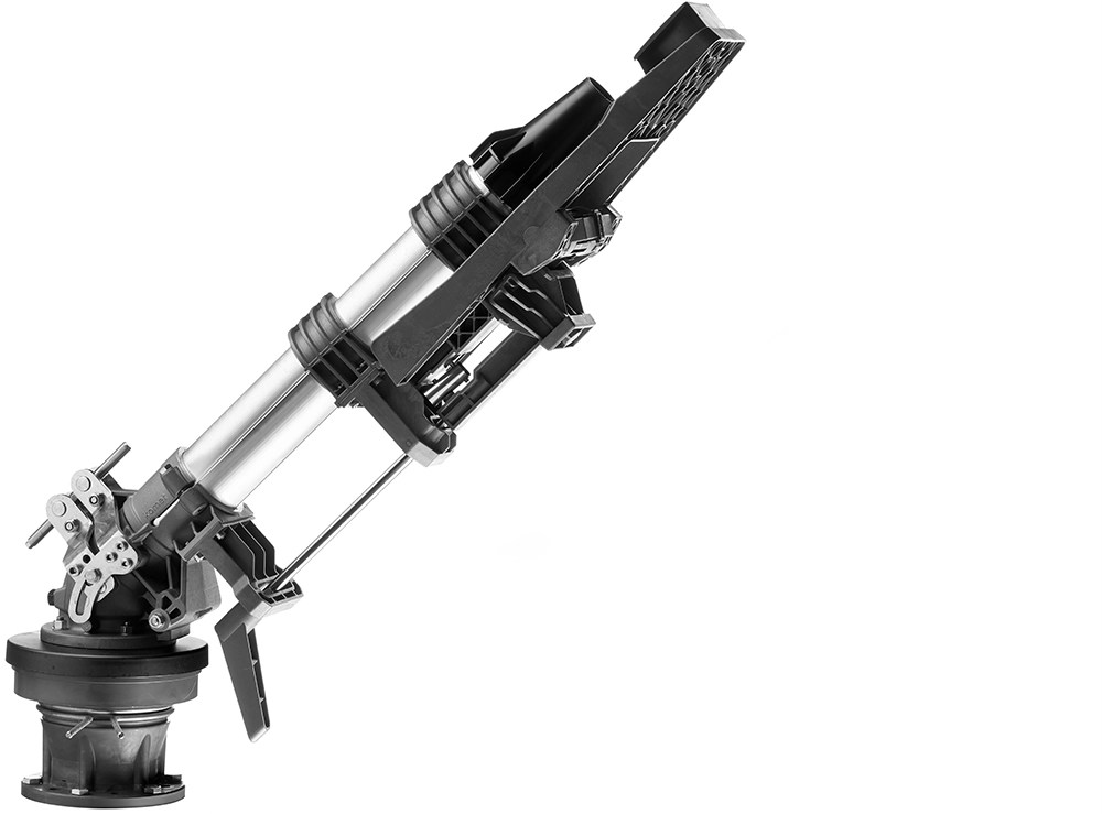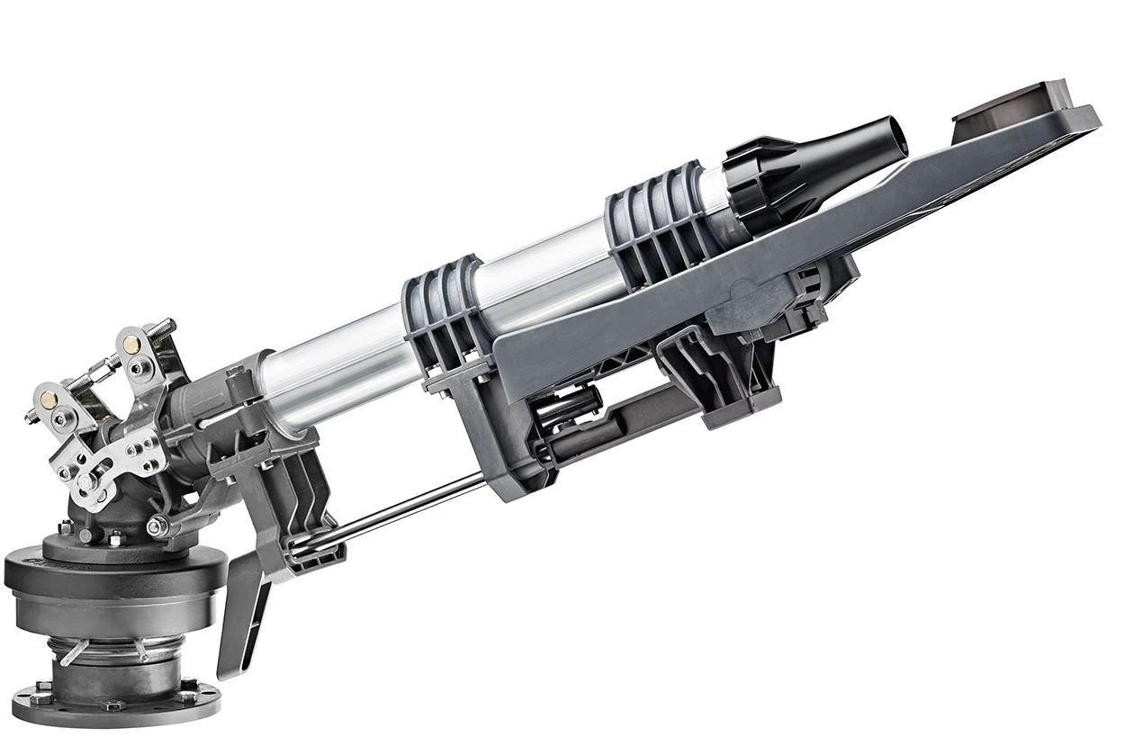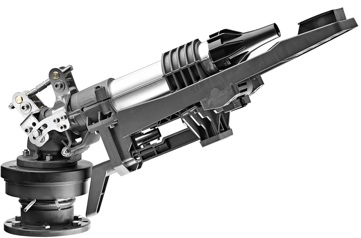 Cañón de riego final para pivots, con trayectoria estrecha de 12° para mayor alcance puntual. |
